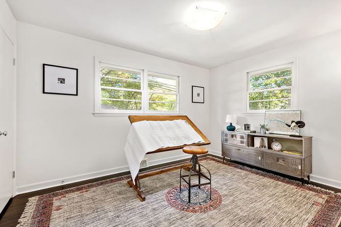 Authentic atomic age brick ranch renovated in true mid-century modern form. Located on a large sprawling corner lot, this newly renovated home stands out with a great new exterior palette and landscaping. The covered two car garage includes a large storage room. Inside, a seamless open concept living-kitchen-dining room feels inviting and warm. In the kitchen is brand new custom cabinets made in North Carolina by Marsh Furniture, stylish quartz countertops, retro mosaic tile backsplash, and a full stainless steel appliance package. Set off from the kitchen is a small breakfast area to the right and formal dining room to the left with an indoor fireplace and statement lighting.