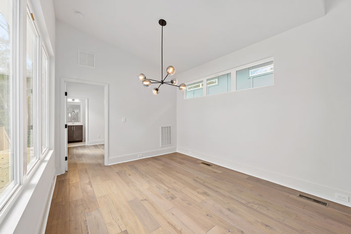 Exceptional modern ranch home by Williams Farrow Builders. One of five modern homes in the Usonia on Lakedell development. Bright and airy open floor plan with vaulted ceiling. Custom Mid-Century inspired kitchen with NC made cabinetry from Marsh Furniture, quartz countertops, oversized tile backsplash and stainless steel appliance package. Master bedroom with spa caliber ensuite bath and walk in closet. Two additional modern full baths. Oversized deck overlooking wooded lot. Rare single story new construction.